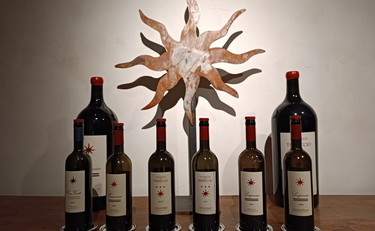 Sulle bottiglie lo stemma del sole stilizzato: negli anni ’80, durante i lavori per piantare i primi vigneti di Lupicaia, fu ritrovato un reperto raffigurante il sole etrusco. Da quel momento è diventato il simbolo della Tenuta.