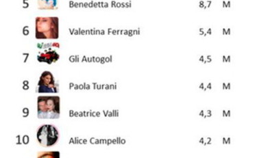 Al quarto posto, con 8,8 milioni di interazioni, la conduttrice televisiva Diletta Leotta, che sorpassa la regina delle videoricette Benedetta Rossi (8,7 milioni).