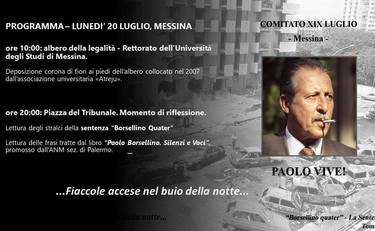 Lunedì 20 Luglio ore 10:00: momento commemorativo presso l’“albero della legalità” collocato nel 2007 - a cura dell’Associazione Universitaria Atreju - nell’aiuola antistante il Rettorato dell’Università degli Studi di Messina insieme ad un piccolo monumento con incisa la celebre frase di Borsellino sul rapporto tra la gioventù e la mafia: “Se la gioventù le negherà il consenso, anche l’onnipotente misteriosa mafia svanirà come un incubo”;