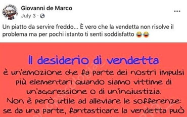 Un post su Facebbok per annunciare la vendetta che si sarebbe preso sui due fidanzati di Lecce, Daniele De Santis e Eleonora Manta. Antonio Giovanni De Marco l'ha scritto nero su bianco su Facebook: "Un piatto da servire freddo...è vero che la vendetta non risolve il problema ma per pochi istanti ti senti soddisfatto". E poi due faccine che ridono a crepapelle. Il tutto postato su Facebook lo scorso 3 luglio.