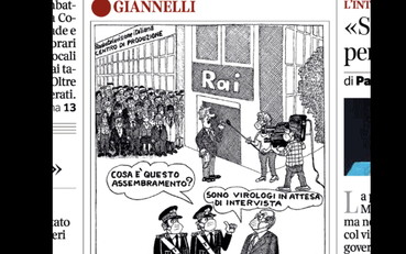 Il migliore editoriale di oggi sul Covid è la splendida vignetta di Giannelli sul Corriere della Sera. L'illustratore satirico denuncia il peggior assembramento dagli inizi della pandemia, in corso da qualche settimana: quello dei virologi alle porte della tv (nella vignetta c'è la Rai) in attesa di lunghe interviste in cui da copione ognuno dice qualcosa al contrario dell’altro spargendo paura e confusione fra i cittadini telespettatori.