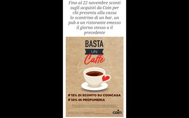 Sconti nei punti vendita se il cliente ha prima consumato in un bar o in un ristorante. È l'iniziativa della catena Coin "Basta un caffè" per supportare le attività che hanno subito limitazioni dalle nuove misure anti-Covid del governo. "Coin intende dimostrare ancora una volta la propria attenzione al territorio e sensibilizzare sulla necessità di impegnarci tutti a dare il nostro contributo, sempre nel rispetto delle norme in vigore e nella piena sicurezza, per contribuire a mantenere vitale l'energia delle nostre città"; ha dichiarato il presidente Giorgio Rossi.
