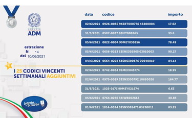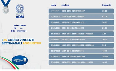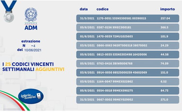 Sono iniziate le prime estrazioni settimanali del 2021 della "Lotteria degli scontrini" fra tutti i corrispettivi trasmessi e registrati dal sistema lotteria dal 31 maggio 2021 al 6 giugno 2021 entro le ore 23:59. A partire da oggi, ogni giovedì verranno effettuate le estrazioni settimanali, per tutti gli scontrini trasmessi e registrati dal sistema lotteria dal lunedì alla domenica, fino alle ore 23:59, della settimana precedente. Se la giornata di estrazione coincide con una festività nazionale, l’estrazione è rinviata al primo giorno feriale successivo. Ecco gli scontrini vincenti estratti oggi.