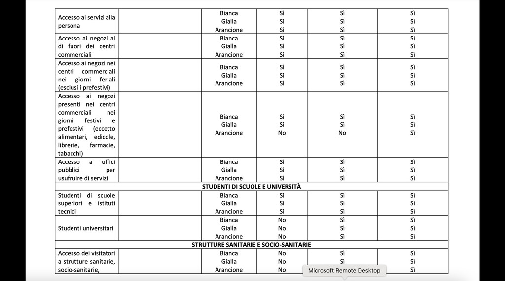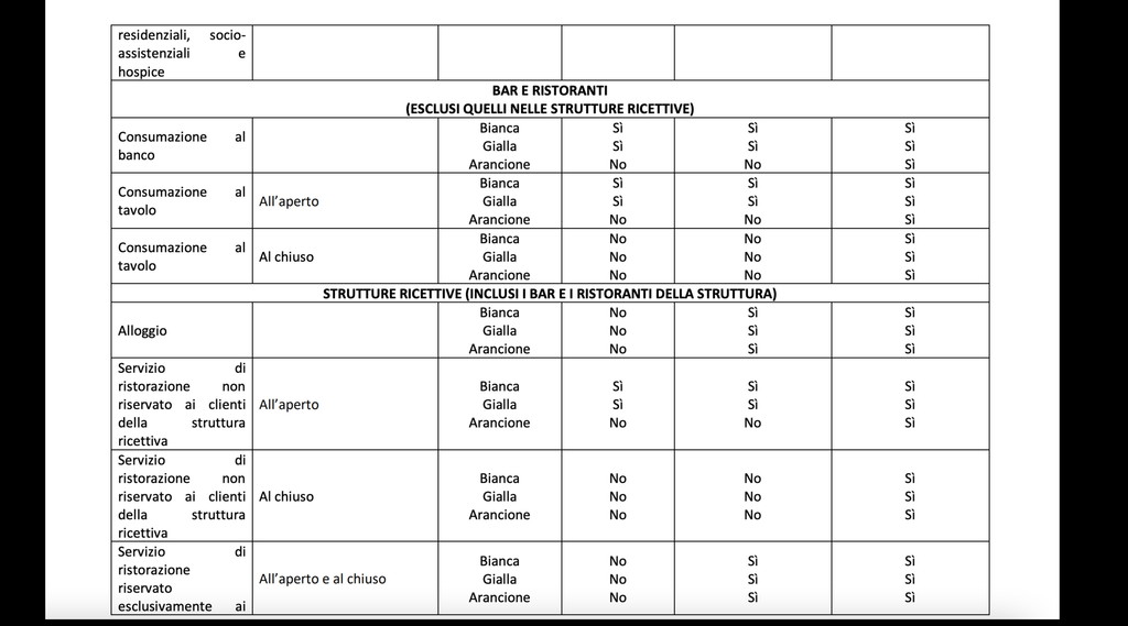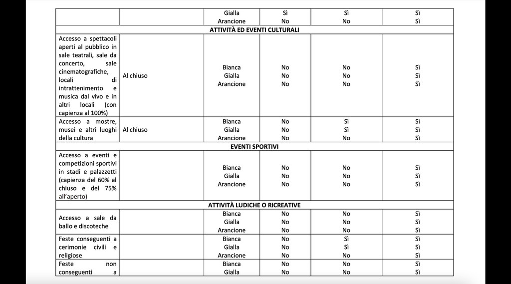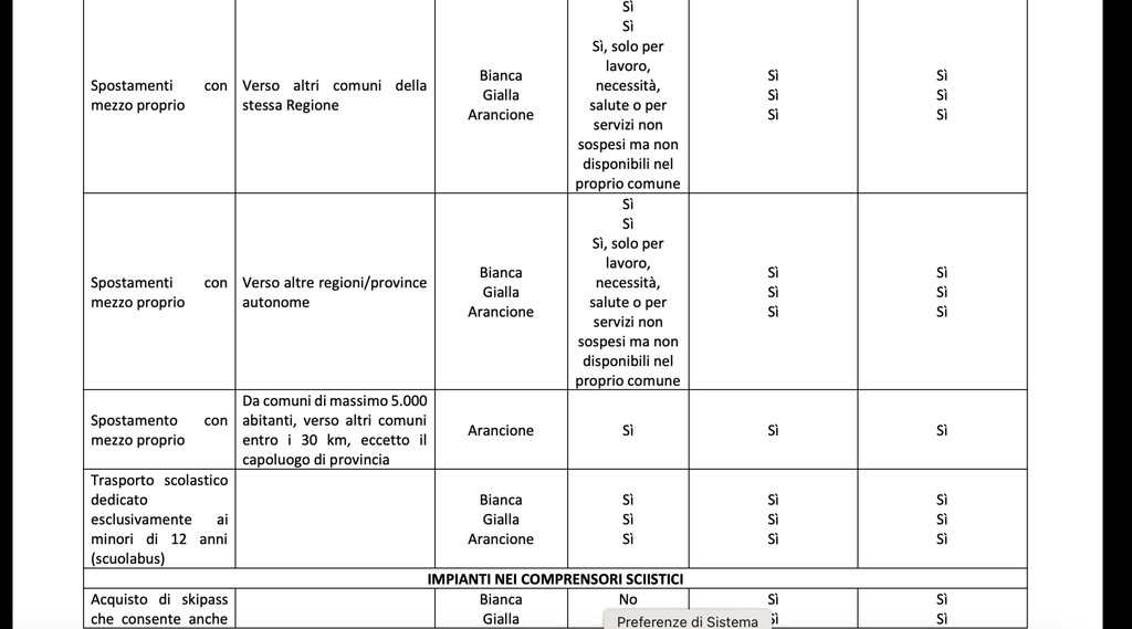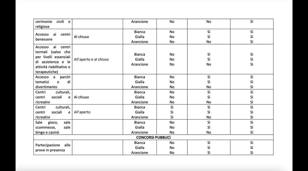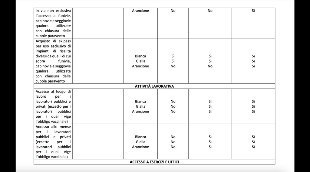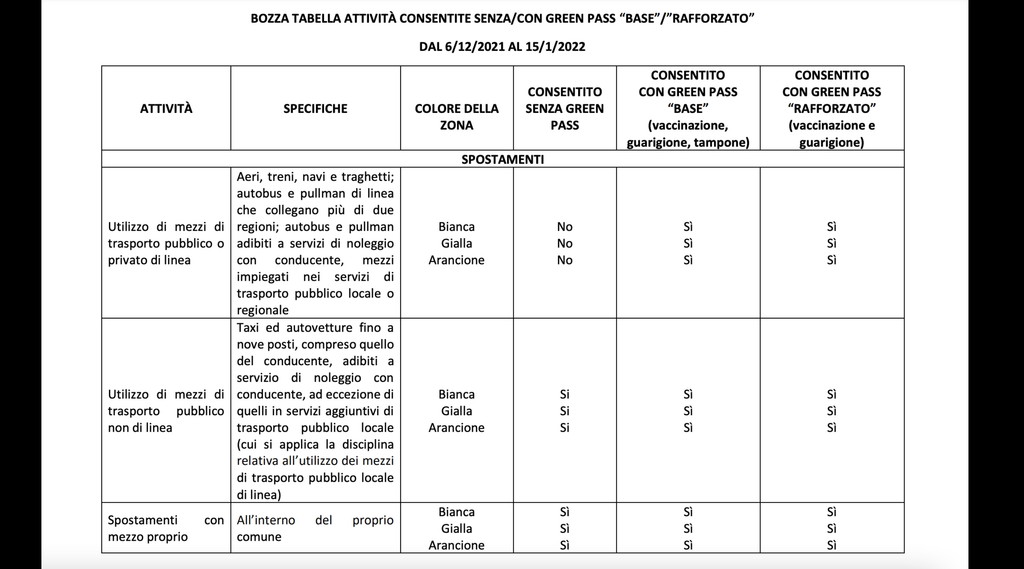 Trasporti, spostamenti in auto, stazioni sciistiche, concorsi pubblici, locali, eventi pubblici... In queste slide ecco la bozza della tabella del governo sull'uso del certificato verde nella versione base e in quella rafforzata, ossia il cosiddetto super green pass. Una stretta che cambia a seconda del colore della Regione - zona bianca, gialla, arancione o rossa - in vigore da lunedì 6 dicembre 2021 al 15 gennaio 2021.