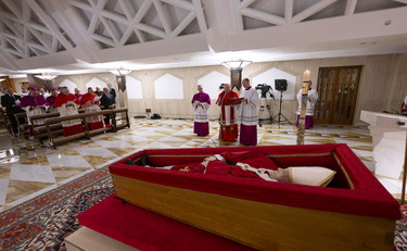 "Domani alle 9, la bara con il defunto Romano Pontefice Francesco sarà portata dalla Cappella della Domus Sanctæ Marthæ alla Basilica Papale di San Pietro, secondo quanto previsto nell'Ordo Exsequiarum Romani Pontificis", ha fatto inoltre sapere l'Ufficio delle celebrazioni liturgiche. "Dopo il momento di preghiera, presieduto dal Cardinale Kevin Joseph Farrell, Camerlengo di Santa Romana Chiesa, ha inizio la traslazione. La processione percorrerà la Piazza Santa Marta e la Piazza dei Protomartiri Romani; dall'Arco delle Campane uscirà in Piazza San Pietro ed entrerà nella Basilica Vaticana attraverso la porta centrale. Presso l'altare della Confessione il Cardinale Camerlengo presiederà la Liturgia della Parola, al termine della quale avranno inizio le visite alla salma del Romano Pontefice".