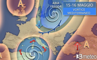 IN ARRIVO POI UN VORTICE DEPRESSIONARIO AL SUD - "Da mercoledì" – prosegue Mazzoleni di 3bmeteo.com – "un vortice depressionario inizierà ad avvicinarsi alle nostre Isole Maggiori, dando così il via a una nuova fase di maltempo che colpirà soprattutto il Meridione." "Giovedì rovesci e temporali interesseranno gran parte del Centro-Sud, con fenomeni localmente intensi tra bassa Sardegna, Sicilia e Calabria, mentre venerdì il maltempo si estenderà anche a Campania, Basilicata e medio-basso Adriatico. Situazione che andrà seguita nel corso dei prossimi giorni, vista l’incertezza della traiettoria del vortice." "Nel frattempo anche al Centro-Nord non mancheranno i consueti rovesci o temporali, specie a ridosso dei rilievi, ma a tratti anche su Val Padana e alto Adriatico."