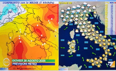La giornata del "crollo termico" - Secondo Sottocorona, sarà venerdì 29 agosto la giornata più critica, con piogge e temporali diffusi su Lombardia, Triveneto e Toscana fino al Lazio. Ma l’elemento più rilevante sarà il drastico abbassamento delle temperature: il “crollo termico” è atteso al Centro e in particolare sull’Est Sardegna, con diminuzioni sensibili anche in Campania. Al Nord la situazione sarà più variegata, con cali termici diffusi e successivi rialzi parziali al Nord-Ovest.