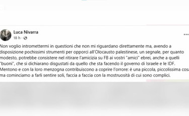 «Ritirare l’amicizia a tutti gli ebrei, anche a quelli buoni». Per Luca Nivarra, ordinario di Diritto Civile all’Università di Palermo, non verrà preso alcun provvedimento nonostante l’invito antisemita rivolto ai suoi contatti Facebook la scorsa settimana. Il professore non era nuovo a questo tipo di esternazioni ma neppure questo è bastato perché l’ateneo prendesse reali provvedimenti. Dall’analisi svolta dall’avvocatura di ateneo, spiega Unipa, «non sono emersi elementi per procedere con ulteriori azioni. ll professor Nivarra ha manifestato le proprie scuse per l’accaduto, gesto che ha contribuito a ricondurre la vicenda nell’alveo del senso di responsabilità individuale». «Alla luce di tali elementi- si legge - la questione può ritenersi conclusa. L’Università degli Studi di Palermo conferma il proprio impegno costante nel tutelare i principi di correttezza, responsabilità e rispetto che devono sempre caratterizzare la vita accademica e istituzionale».