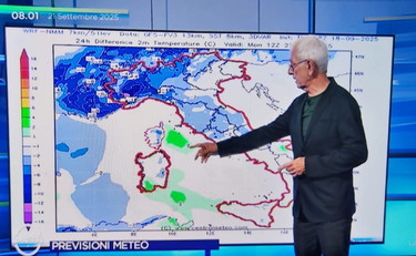 La situazione delle temperature massime è significativa: sono ancora relativamente elevate al centro e al sud, ma al nord già si comincia a vedere un calo. La tendenza nelle prossime 24 ore vede poche variazioni al sud, diminuzioni la centro e al nord e un crollo deciso sulle zone di nord ovest: "6, 7, 8 gradi, addirittura zone con 10-12 gradi in meno", spiega Sottocorona che parla di "calo esteso" e di un autunno che dimostra di esserci.