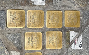 Adesivi pro Pal incollati vicino alle “pietre” che ricordano le vittime di Auschwitz
