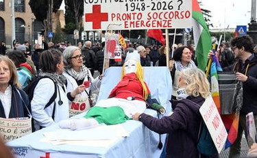 Referendum, al corteo per il No bambola raffigurante Giorgia Meloni sulla barella del pronto soccorso