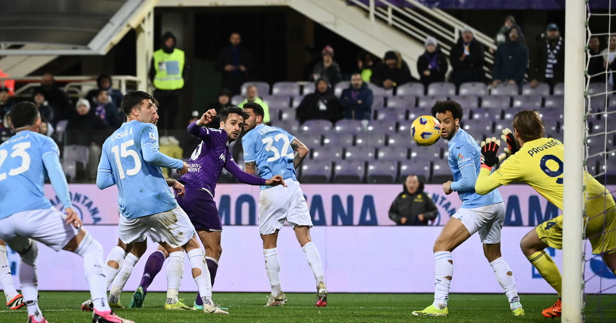 Italiano punta sul solito 4-2-3-1, recupera Biraghi e schiera una squadra molto offensiva con Bonaventura mediano accanto a Arthur. Gonzalez, Beltran e Sottil agiscono dietro a Belotti. Alla fine Sarri recupera il febbricitante Casale al posto dello squalificato Gila, unica reale novità rispetto alla trasferta di Torino.Fiducia a Lazzari a destra, Cataldi in regia affiacanto da Guendouzi e Luis Alberto. tridente d’attacco formato da Isaksen-Immobile-Felipe. Si comincia con l’assalto viola che domina il gioco per tutto il primo tempo. La Lazio arretra si arrocca vicino a Provedel che è pure alle prese con l’influenza e richiama più volte la panchina. Lo show viola parte con tre angoli in un minuto e mezzo, poi con tre pali clamorosi, due tra il 19’ e il 24’: prima Gonzalez imbuca a giro ma la manona del portiere laziale devia sul legno, poi Belotti stacca sulle spalle di Casale e colpisce ancora il palo, imitato poco dopo da Biraghi. È un monologo con i biancocelesti che soffrono in tutte le zone del campo, Arthur e Bonaventura inventano ma gli attaccanti sono imprecisi e la difesa di Sarri resiste. E aspetta l’errore dei dirimpettai che arriva al tramonto di un altro primo tempo di grande sofferenza proprio come tre giorni prima a Torino: sbaglia Ranieri in uscita, Isaksen e Immobile trovano Guendouzi, assist al bacio per Luis Alberto che infila Terracciano: tutto troppo facile con uno schieramento difensivo rivedibile.