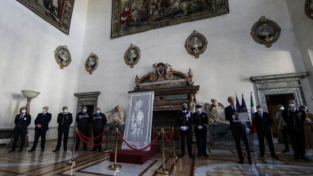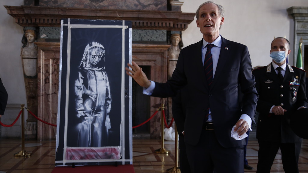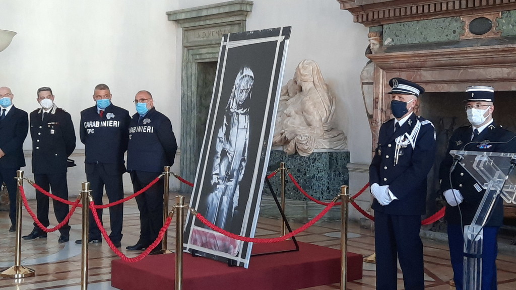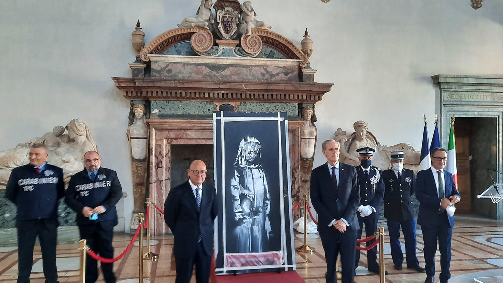 La cerimonia si è svolta questo pomeriggio nel salone d’Ercole di palazzo Farnese, sede dell’ambasciata di Francia in Italia. A svelare di nuovo la «donna in lutto» di Banksy a giornalisti e fotografi è stato l’ambasciatore Christian Masset, insieme al procuratore capo de l’Aquila Michele Renzo e al comandante dei carabinieri della Tutela patrimonio culturale, il generale Roberto Riccardi. Il recupero della porta è infatti avvenuto grazie alla collaborazione tra le magistrature e le forze di polizia dei due paese, in particolare i carabinieri del Tpc e della compagnia di Alba adriatica e la gendarmeria del secondo distretto di Parigi, che svolse le indagini anche dopo l’attentato del novembre 2015.