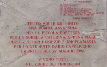 Era l'1:04 di notte tra il 26 e il 27 maggio 1993, quando la mafia fece detonare una bomba in via dei Georgofili a Firenze, per colpire il cuore culturale italiano, con danni ingenti agli Uffizi. Lo scoppio dell'autobomba, imbottita con 277 chilogrammi di esplosivo, provocò l'uccisione di 5 persone: i coniugi Fabrizio Nencioni (39 anni) e Angela Fiume (31 anni) con le loro figlie Nadia (9 anni) e Caterina (appena 50 giorni di vita) e lo studente Dario Capolicchio (22 anni), nonché il ferimento di 38 di persone. Quell'attentato fu ricollegato alle altre stragi di mafia del periodo 1992-1993, quando Cosa nostra alzò il tiro, uccidendo prima i due magistrati Falcone e Borsellino, poi colpendo “in continente” perché “se uccidi un magistrato o un poliziotto, ne mettono un altro, ma se butti giù un monumento, come fanno?” come dicevano alcuni capimafia intercettati. La strage di via dei Georgofili si inserì in un'epoca molto significativa, anche dal punto di vista politico. A 32 anni da quella tragica notte la verità sulla strage non è ancora stata raggiunta. Dopo le condanne degli esecutori materiali e di alcuni vertici di Cosa nostra si indaga ancora sui mandanti e per capire se nell'attentato di Firenze c'è stata la ferma volontà della mafia di rispondere alle leggi dello Stato colpendo il suo patrimonio artistico.
