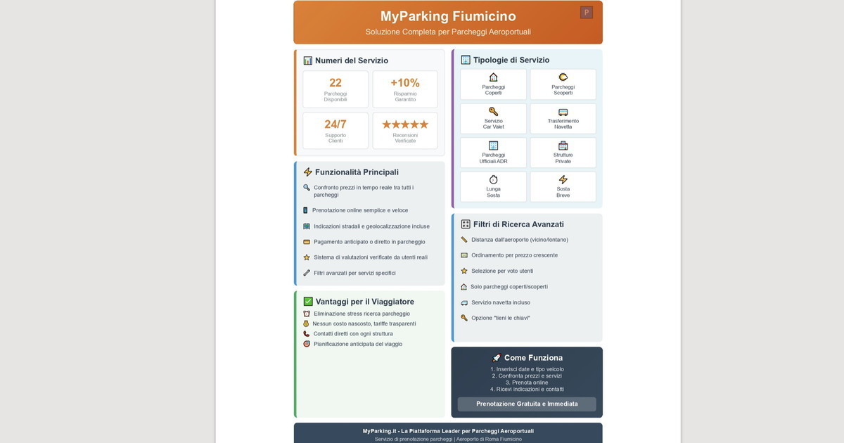 Un esempio emblematico è costituito da MyParking, una piattaforma online che agisce come un aggregatore intelligente per le soluzioni di sosta. Con 22 opzioni di parcheggio all’aeroporto di Fiumicino su MyParking.it, il servizio risponde a un'esigenza concreta, offrendo trasparenza e convenienza.