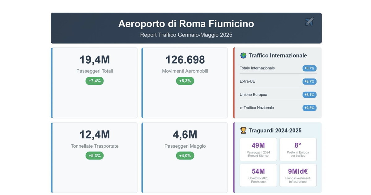 Non è più una semplice ripresa, ma una vera e propria accelerazione. I dati relativi ai primi cinque mesi del 2025 per l'aeroporto di Roma Fiumicino "Leonardo da Vinci" non lasciano spazio a interpretazioni: lo scalo capitolino non solo ha consolidato le eccezionali performance del 2024, ma si sta proiettando verso nuovi traguardi.