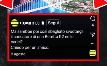«Ma sarebbe poi così sbagliato svuotargli il caricatore di una Beretta 92 nelle narici?». Lo ha scritto tale giovanni.talli su Instagram riferendosi al vicepremier e ministro delle Infrastrutture e dei Trasporti, Matteo Salvini. Un leone da tastiera probabilmente, che riflette il clima di tensione che si respira giornalmente e col quale si ritrovano a combattere leader di maggioranza e non solo. A ogni modo, è solo una delle tante minacce e intimidazioni che hanno come bersaglio il segretario Lega.