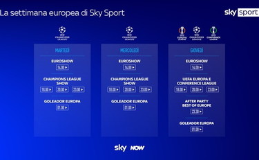 Il giovedì, invece, sarà il giorno della UEFA Europa League, al via eccezionalmente mercoledì 24 settembre, e della UEFA Conference League, che scatterà il 2 ottobre. Ad accompagnare i pre e i postpartita dei 342 incontri, oltre ai talent di Sky Sport, il lavoro della redazione di Sky Sport e i commenti autorevoli dei giornalisti Stefano De Grandis, Marco Bucciantini, Gianfranco Teotino, con la conduzione di Mario Giunta e Vittoria Orlando allo spazio news per tutti gli insight di giornata.