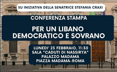 Lunedì 23 febbraio, alle ore 11:30, presso la Sala "Caduti di Nassirya" di Palazzo Madama, si terrà la conferenza stampa dal titolo "Per un Libano democratico e sovrano". L’iniziativa, promossa dalla Senatrice Stefania Craxi, Presidente della Commissione Affari Esteri e Difesa del Senato, intende accendere i riflettori sulla delicata fase di transizione che sta attraversando il Paese dei Cedri.