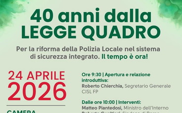 La CISL FP Nazionale organizza il convegno dal titolo "40 anni dalla Legge Quadro sulla Polizia Locale: il tempo è ora!". L'evento si terrà domani a Roma, venerdì 24 aprile 2026, a partire dalle ore 9:30, presso la Sala del Tempio di Vibia Sabina e Adriano della Camera di Commercio di Roma, in Piazza di Pietra. L'iniziativa nasce dalla necessità di discutere una riforma vera per la Polizia Locale e la costruzione di un sistema di sicurezza integrato, temi ritenuti non più rinviabili dopo quarant'anni di attesa.