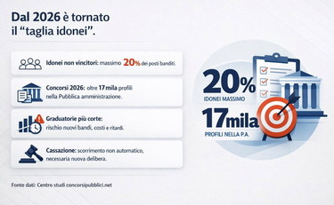 Il 2026 si è aperto con un cambio di regole che riguarda da vicino le centinaia di migliaia di candidati impegnati nelle selezioni per la Pubblica amministrazione. Dal 1° gennaio è infatti tornata pienamente applicabile la cosiddetta norma "taglia idonei", che limita al 20% dei posti messi a concorso il numero massimo di candidati idonei non vincitori che possono essere inseriti in graduatoria. Una soglia rigida, che riduce sensibilmente il bacino a cui le amministrazioni possono attingere in caso di rinunce o scorrimenti, e che era stata congelata nel biennio 2024-2025 dal Decreto-legge n. 25/2025 (cosiddetto Decreto PA).