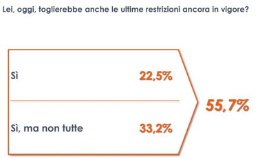Discorso analogo per quanto riguarda le discoteche – attività fortemente penalizzate – e la loro riapertura in vista dell’estate. Anche in questo caso, oltre la metà degli italiani (56,7%) si dichiara favorevole alla loro riapertura, ma con delle restrizioni come l’accesso ai soli vaccinati e/o con tampone negativo, oppure limitare l’attività ad aperitivi e cene, sempre nel rispetto di tutte le normative anti-Covid.