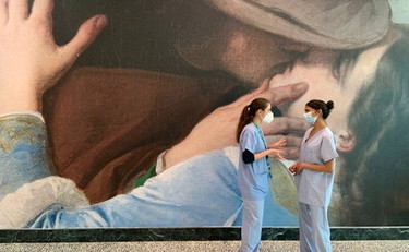 Accomodarsi in sala d’attesa prima del ricovero e trovarsi nel giardino di “Un dopo pranzo”, sotto lo sguardo calmo delle donne ritratte dal Lega. Prepararsi alla seduta di Chemioterapia in 40 metri quadri di giardino ricolmo di zucche, in compagnia della “Fruttivendola” del Campi. Riposare tra le pennellate azzurre di Raffaello, all’ombra del tempio dello “Sposalizio della Vergine” su 12 metri di parete nell’area Check Up. Camminare verso gli spogliatoi degli infermieri, al piano interrato dell’ospedale, lungo 23 metri di boschi e i campanili dei panorami lombardi del Bellotto. Perdersi tra le acque placide di un paesaggio che, nell'”Annunciazione” del Francia, costituisce il piccolo sfondo della scena principale e che ora, in ospedale, diventa un’opera d’arte indipendente di 10 metri quadri. Lasciarsi trasportare da “Il Bacio” di Hayez sugli 8 metri di parete all’ingresso. O ancora, sentire la dolcezza del tocco delle mani de “Gli amanti veneziani”, di Bordon, nella sala d’attesa del Fertility Center.