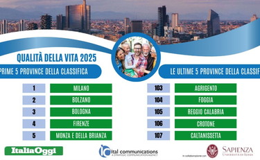 MILANO (ITALPRESS) – Milano conquista nuovamente il primo posto, con ottimi risultati nella dotazione di servizi, reddito, gestione delle infrastrutture, vitalità del tessuto produttivo, seguita da Bolzano e Bologna, nell’Indagine annuale sulla qualità della vita 2025 nelle province italiane, realizzata da ItaliaOggi e Ital Communications, in collaborazione con l’Università Sapienza di Roma, giunta alla 27^ edizione. Rispetto alla classifica dello scorso anno, per Milano e Bolzano si tratta di una conferma, mentre migliora Bologna che sale di una posizione. Due passi indietro, invece, per Monza e della Brianza, mentre si segnala un significativo avanzamento in graduatoria di Rimini e Ascoli Piceno, rispettivamente al 12° e 15° posto, con oltre venti posizioni guadagnate rispetto al 2024. Ancora in fondo alla classifica Caltanissetta (107ª), preceduta da Crotone (106^), che scende di cinque posizioni in un anno e Reggio Calabria (105^), che invece conquista un posto. Da rilevare, in negativo, Foggia, che passa dalla 93^ alla 104^ postazione in classifica, Pordenone dalla 9^ alla 23^ e Gorizia dalla 26^ alla 52^.
