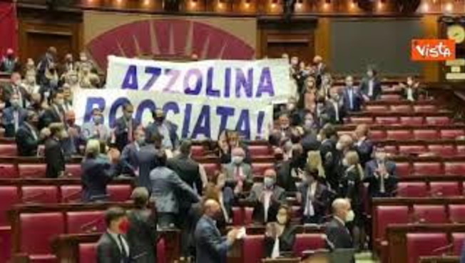 "Azzolina bocciata", lo striscione della Lega in aula alla Camera, seduta sospesa