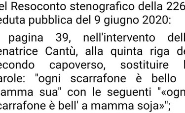 L'ultima follia del Senato è quella di correggere i resoconti per non turbare i napoletani. Nel resoconto stenografico della 226a seduta pubblica del 9 giugno 2020 a pagina 39, nell'intervento della senatrice Cantù, avviene la modifica incredibile: alla quinta riga del secondo capoverso - si legge nel documento - sostituire le parole "ogni scarrafone è bello a mamma sua" con le seguenti "ogne scarrafone è bell' a mamma soja".