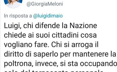 La leader di Fratelli d'Italia gli ricorda la prima regola della democrazia (i bimbi spesso dimenticano le lezioni di vita) : "Luigi, chi difende la Nazione chiede ai suoi cittadini cosa vogliano fare. Chi si arroga il diritto di saperlo per mantenere la poltrona, invece si sta occupando solo del tornaconto personale". Chi ama la poltrona, mr. Di Maio, non la Nazione. E' a questo che stiamo assistendo ora...