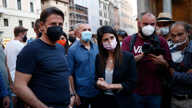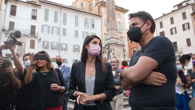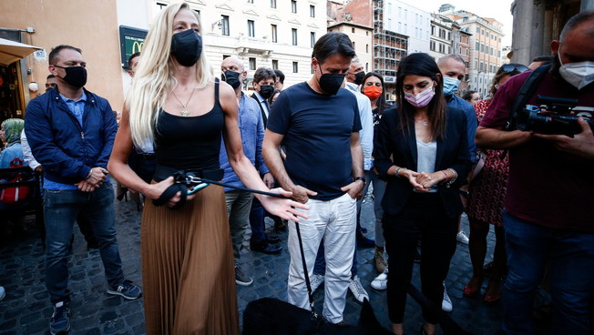 Il leader grillino si concede prima ai fotografi con la fidanzata Olivia Paladino e il cane, poi scatta l'ora dei selfie con i passanti. Non dice una parola sulla manifestazione in corso nel centro di Roma. Il colpo di scena arriva però con la sindaca di Roma Virginia Raggi che appare in piazza quando il sit-in è quasi finito insieme con il suo portavoce: la prima cittadina invece di andare verso gli organizzatori si fionda da Conte, fermandosi a parlare con lui mentre i fotografi immortalano la scena con la Raggi che si scioglie in complimenti per il cagnolino della fidanzata.