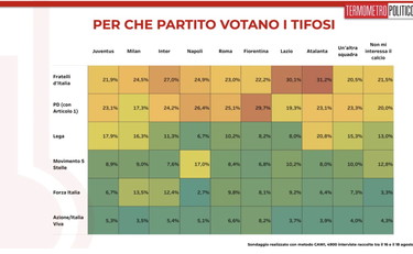 "Fratelli d’Italia è il primo partito: piace a più del 30% tra i laziali" mentre "tra i tifosi dell'Atalanta (Bergamo) raggiunge il 31,2%, davanti alla Lega citata da oltre il 20% dei tifosi. È invece più debole tra gli juventini" si legge nell'analisi di TP. La Fiorentina raduna "più tifosi di sinistra. Il Pd infatti appare poco popolare tra i milanisti e i laziali ed è invece forte con il 29,7% tra chi tifa" viola, che gradisce anche Azione e Italia Viva (8,2%). A Napoli va forte il Movimento 5 stelle (17%), a Milano tifano sempre Silvio Berlusconi (13,5% tra i milanisti e al 12,4% tra gli interisti).