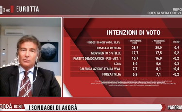 Dall'ultimo sondaggio politico di Emg-Different presentato da Fabrizio Masia lunedì 14 novembre emergono dati che fanno pensare a un consolidamento del risultato elettorale del 25 settembre, ma non mancano elementi a sorpresa. Nel corso di Agorà, su Rai 3, il sondaggista fotografa le intenzioni di voto a quasi due mesi dalle elezioni politiche. "Fratelli d'Italia consolida la sua forza e supera abbondantemente Il 28%, ricordiamo che poche settimane fece il 26%", afferma Masia.
