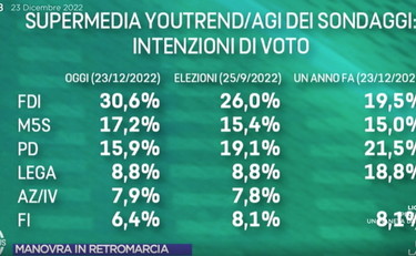 Fratelli d'Italia chiude il 2022 con il botto e cresce ancora di un punto in due settimane. Da sottolineare anche l'8,8% della Lega che è in costante risalita. Chi ha perso consensi in quest'ultimo periodo Forza Italia (-0,5%) e soprattutto il Pd che scende ancora sotto il 16%, al 15,9 perdendo quasi un punto percentuale (-0,8). La parabola dei dem che in un anno ha perso ben il 24% dei consensi.