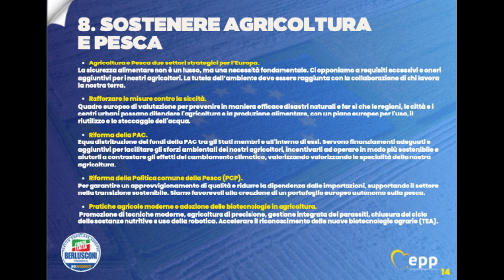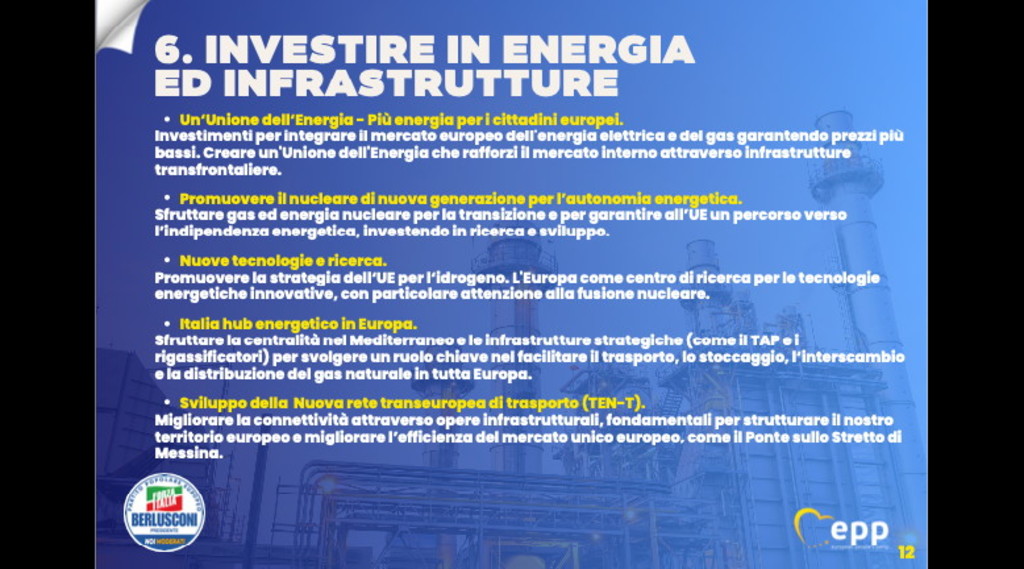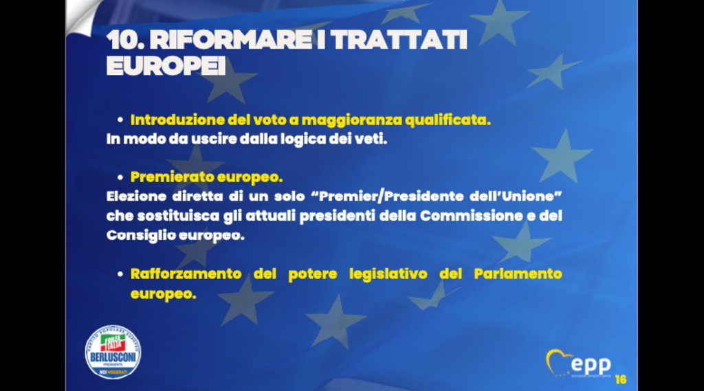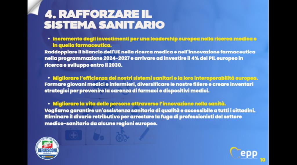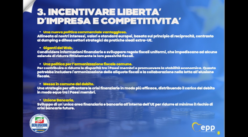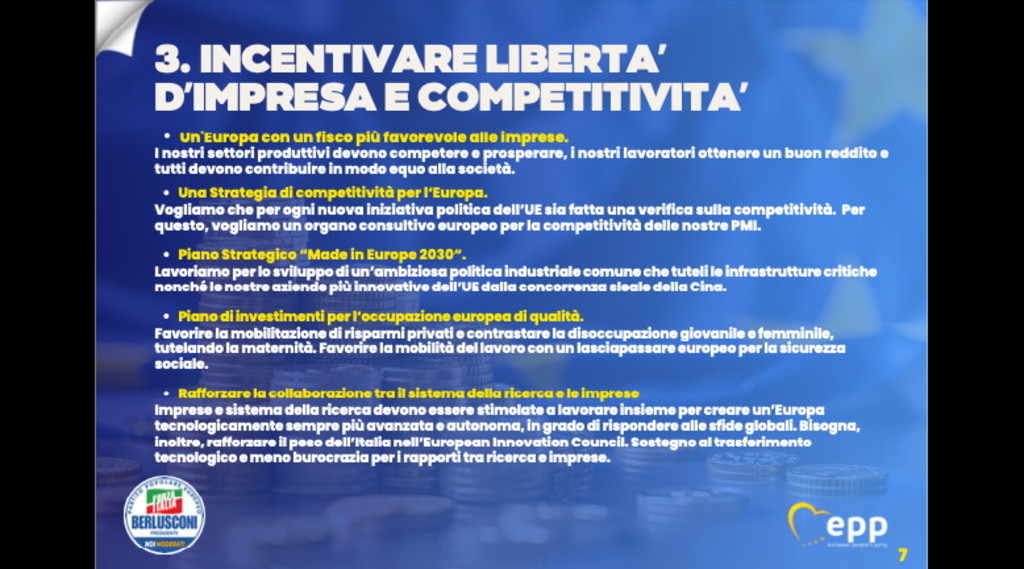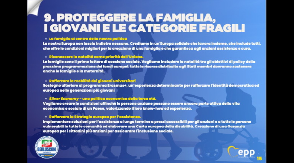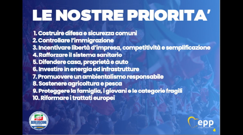 Si apre con una citazione di Silvio Berlusconi il programma di Forza Italia per le elezioni europee dell'8 e 9 giugno, spartiacqua fondamentale per il futuro dell'Ue. "Forza Italia è il partito del mondo senza frontiere. Forza Italia è il partito della libertà, della democrazia, del cristianesimo, è il partito della dignità, del rispetto, di tutte le persone. Forza Italia è il partito per me, per te, per tutti". Sicurezza, immigrazione, economia, giovani: ecco i punti del programma del partito guidato da Antonio Tajani tra valori e priorità per una nuova Europa.