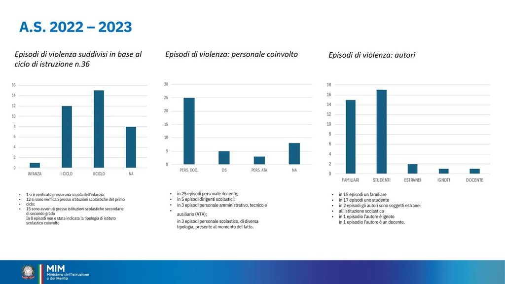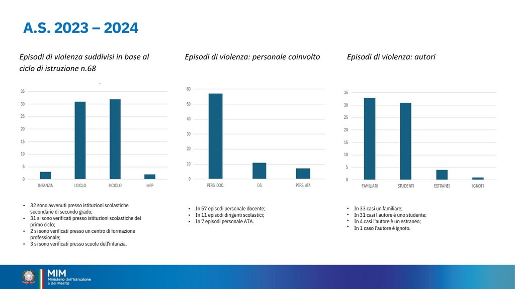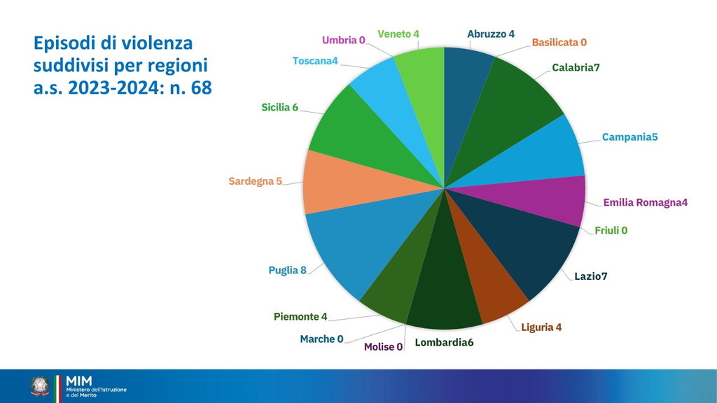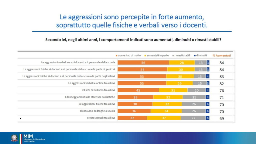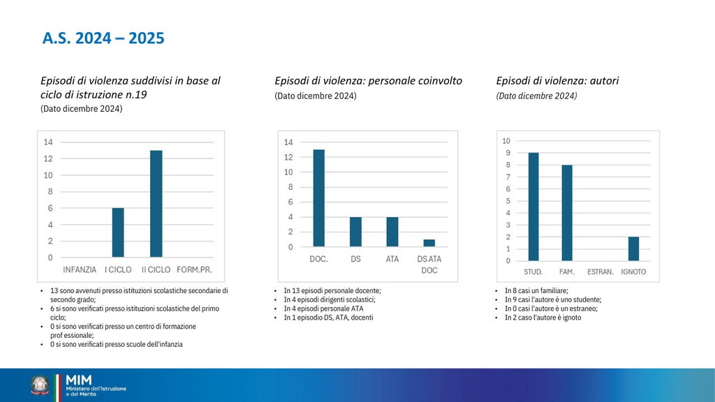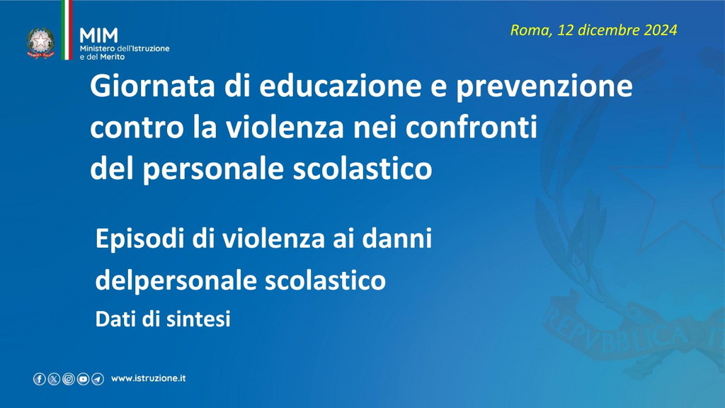 È stata istituita per il 15 dicembre la Giornata nazionale di educazione e prevenzione contro la violenza nei confronti del personale scolastico. Oggi il ministro Giuseppe Valditara ha incontrato una rappresentanza, da tutte le regioni d’Italia, di dirigenti scolastici, docenti e personale ATA. “Oggi è una giornata importante perché per la prima volta viene dato rilievo istituzionale al tema del rispetto nei confronti del personale della scuola. Ed è anche significativo che le numerose misure siano avallate dai cittadini italiani: c’è consenso sul fatto che bisogna ridare autorevolezza nei confronti del personale della scuola e che le misure fin qui adottate vanno nella direzione giusta, penso alla sanzione pecuniaria da 500 a 10 mila euro per le aggressioni, penso alle attività di cittadinanza solidale”, ha dichiarato (Il video). I dati raccolti sono significativi. Dall’annata 2022-2023 all’annata 2023-2024 gli episodi sono quasi raddoppiati: da 36 a 68 episodi di violenza segnalati. Gli episodi riguardano tutto il personale scolastico, principalmente il personale docente. Gli aggressori sono soprattutto gli studenti e i loro familiari. Nell’annata 2024-2025 sono già stati registrati casi di violenza.
