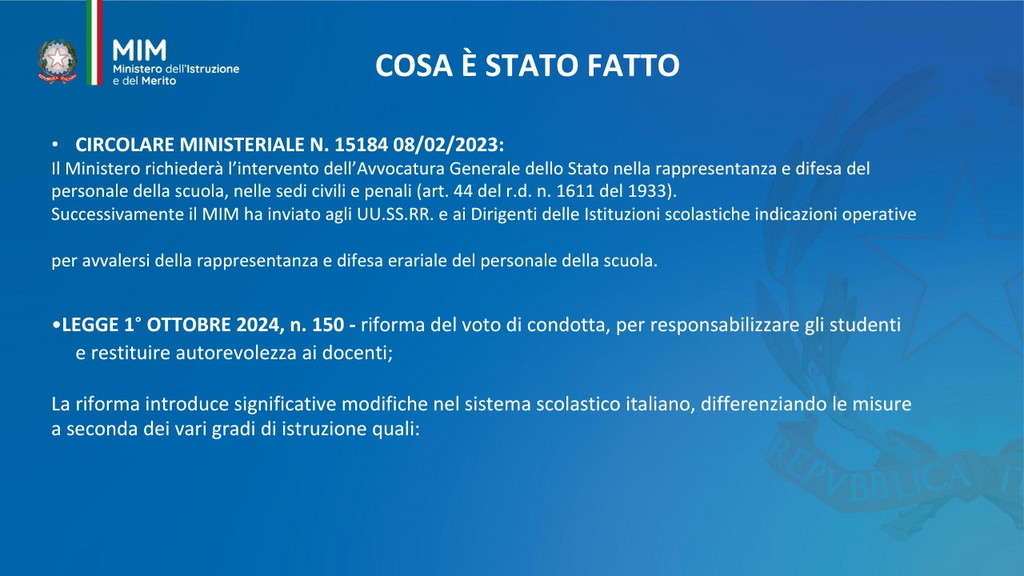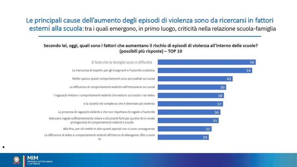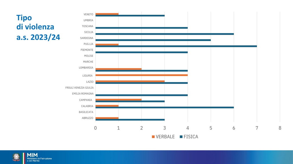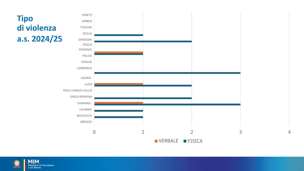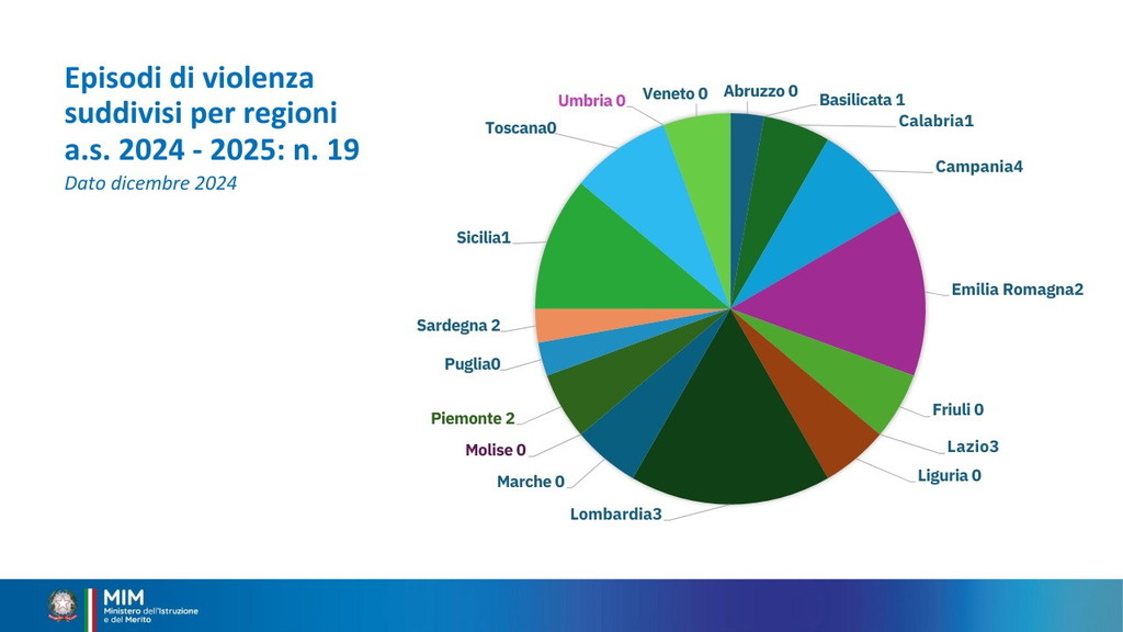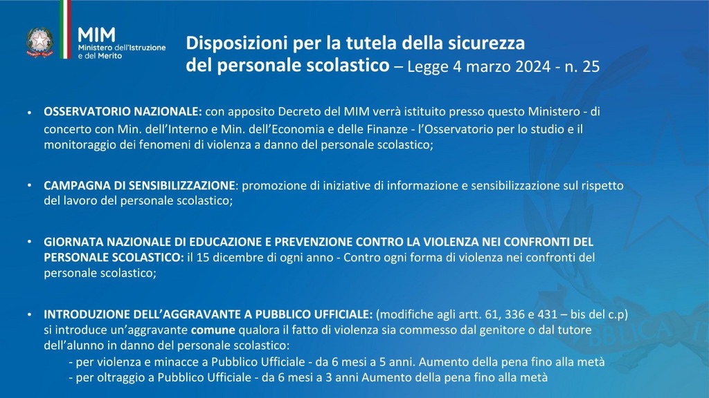 È stata istituita per il 15 dicembre la Giornata nazionale di educazione e prevenzione contro la violenza nei confronti del personale scolastico. Oggi il ministro Giuseppe Valditara ha incontrato una rappresentanza, da tutte le regioni d’Italia, di dirigenti scolastici, docenti e personale ATA. “Oggi è una giornata importante perché per la prima volta viene dato rilievo istituzionale al tema del rispetto nei confronti del personale della scuola. Ed è anche significativo che le numerose misure siano avallate dai cittadini italiani: c’è consenso sul fatto che bisogna ridare autorevolezza nei confronti del personale della scuola e che le misure fin qui adottate vanno nella direzione giusta, penso alla sanzione pecuniaria da 500 a 10 mila euro per le aggressioni, penso alle attività di cittadinanza solidale”, ha dichiarato (Il video). I dati raccolti sono significativi. Dall’annata 2022-2023 all’annata 2023-2024 gli episodi sono quasi raddoppiati: da 36 a 68 episodi di violenza segnalati. Gli episodi riguardano tutto il personale scolastico, principalmente il personale docente. Gli aggressori sono soprattutto gli studenti e i loro familiari. Nell’annata 2024-2025 sono già stati registrati casi di violenza.