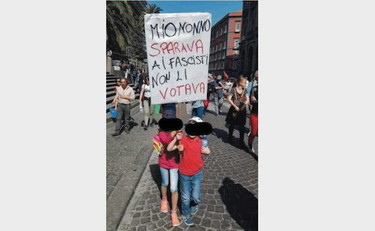 25 aprile, il cartello antifascista in mano a due bambini
