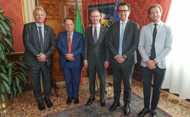 (Arv) Venezia, 23 aprile 2026 - Il vicepresidente del Consiglio regionale del Veneto, Francesco Rucco, che ha portato i saluti istituzionali del Presidente del Consiglio Veneto, Luca Zaia, e il consigliere segretario dell'Ufficio di presidenza, Jacopo Maltauro, con il Segretario generale del Consiglio Veneto, Roberto Valente, la dirigente della Direzione relazioni internazionali della Giunta regionale del Veneto, Annalisa Bisson, e Valeria Motterle, responsabile Rapporti diplomatici ed attività internazionali dell'esecutivo veneto, hanno ricevuto questa mattina a Venezia, nel Salone della Presidenza di palazzo Ferro Fini, una delegazione del Consiglio Cantonale di Zurigo (Svizzera) guidata dal Presidente, Beat Habegger, e formata da Romaine Rogenmoser e Monika Wicki, vicepresidenti del Consiglio cantonale, dai capigruppo Thomas Forrer, Marzena Kopp, Judith Stofer, Christa Stünzi e Claudio Zihlmann, dai componenti del Consiglio Cantonale, Tumasch Mischol e Christoph Ziegler, dagli ex presidenti del Consiglio Cantonale, Dieter Kläy e Benno Scherrer, e dal Segretario generale Moritz von Wyss.
