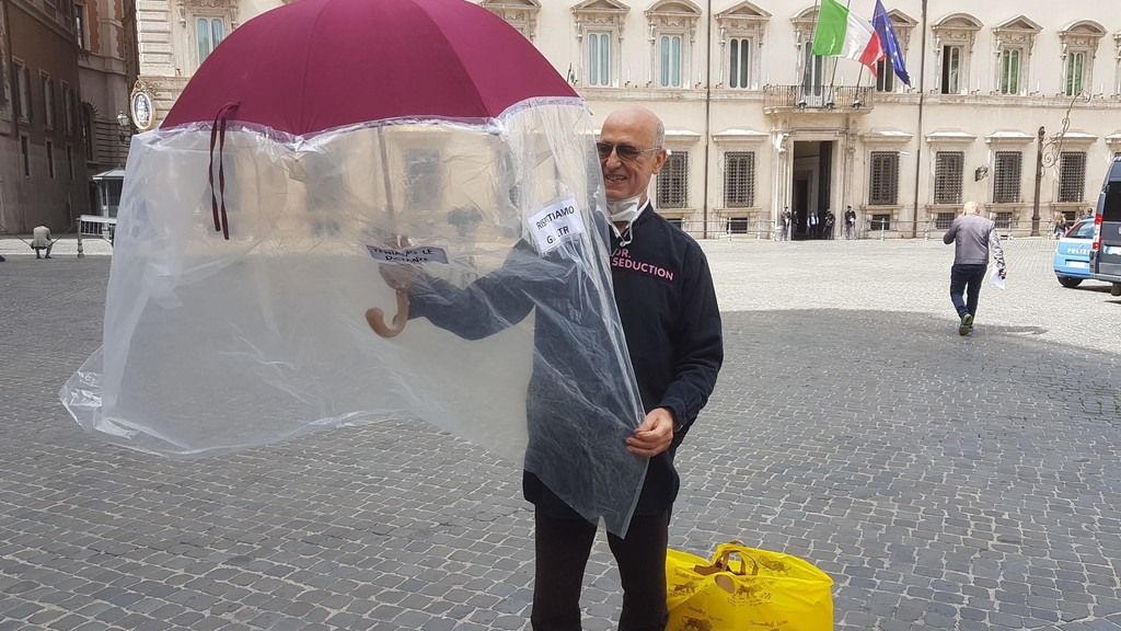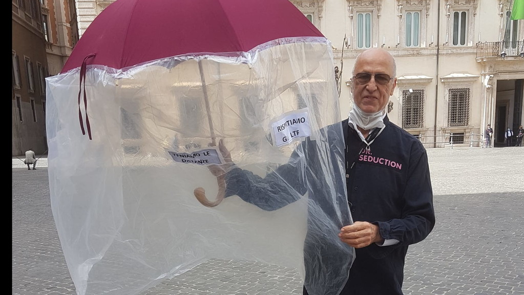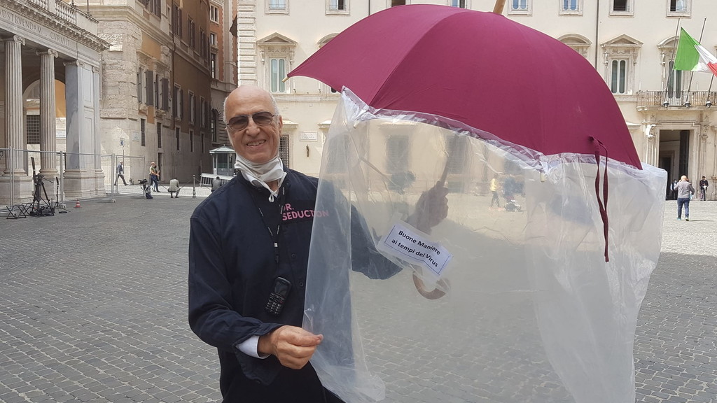 Quando lo hanno visto con quello strano ombrello, gli agenti che controllano piazza Colonna, «blindata» ormai quasi ogni giorno anche prima della pandemia, lo hanno subito identificato. Sì, perché Giuseppe Cirillo, che spiega di essere psicologo e fondatore della «Scuola di Corteggiamento», era proprio davanti Palazzo Chigi con il suo «parapioggia distanziante». In realtà, un normale ombrello con l’aggiunta di un telo di cellophane che permette di vedere all’esterno ma impedirebbe agli altri di avvicinarsi.