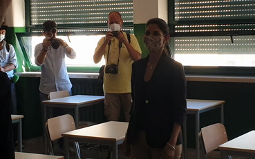 Mascherina fashion e capelli raccolti. La sindaca Raggi consegna personalmente i primi 88 banchi monoposto al Liceo Augusto di via Gela, al fianco del vicesindaco di Città Metropolitana Teresa Maria Zotta e della dirigente scolastica Giuseppina Rubinacci. Ressa di giornalisti e stringenti misure anti-Covid.