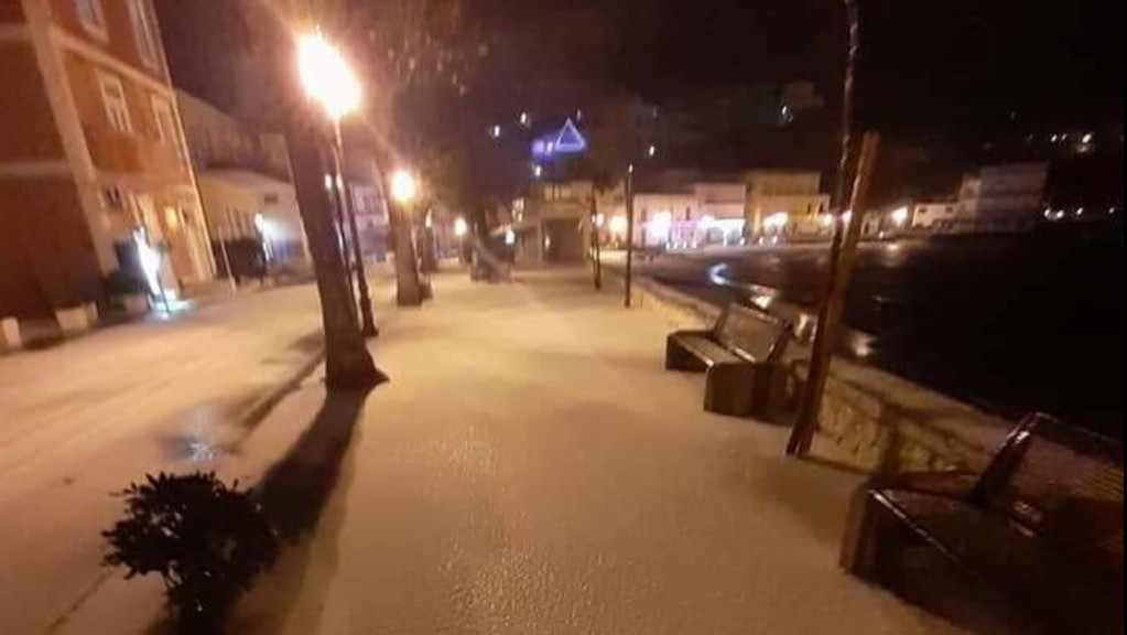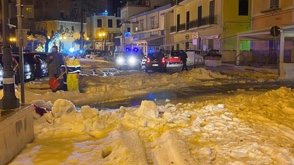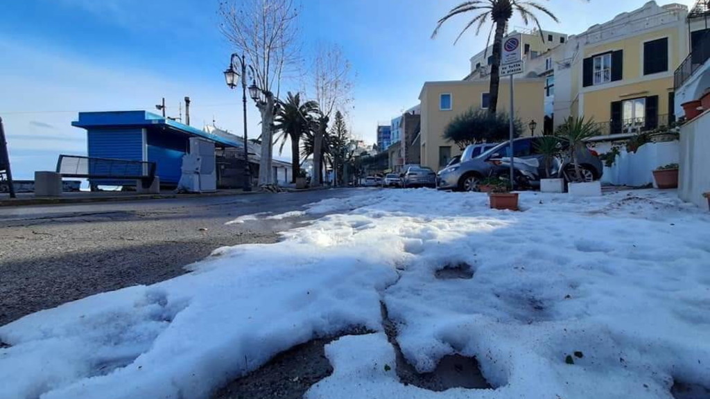 Effetto neve: grandinata eccezionale su Ponza nella notte con strade e spiagge ricoperte dal ghiaccio, in un'atmosfera natalizia incredibilmente suggestiva.