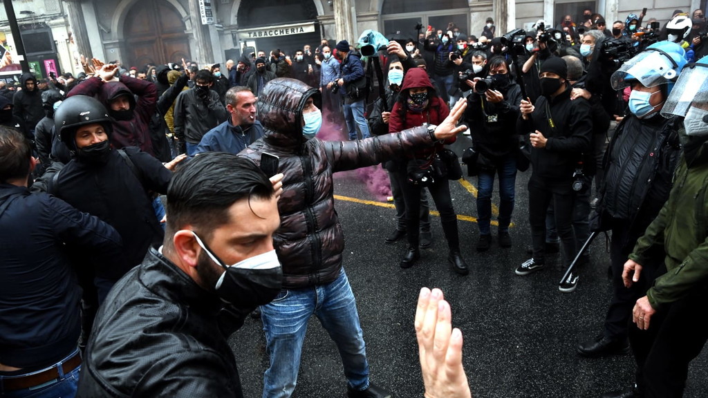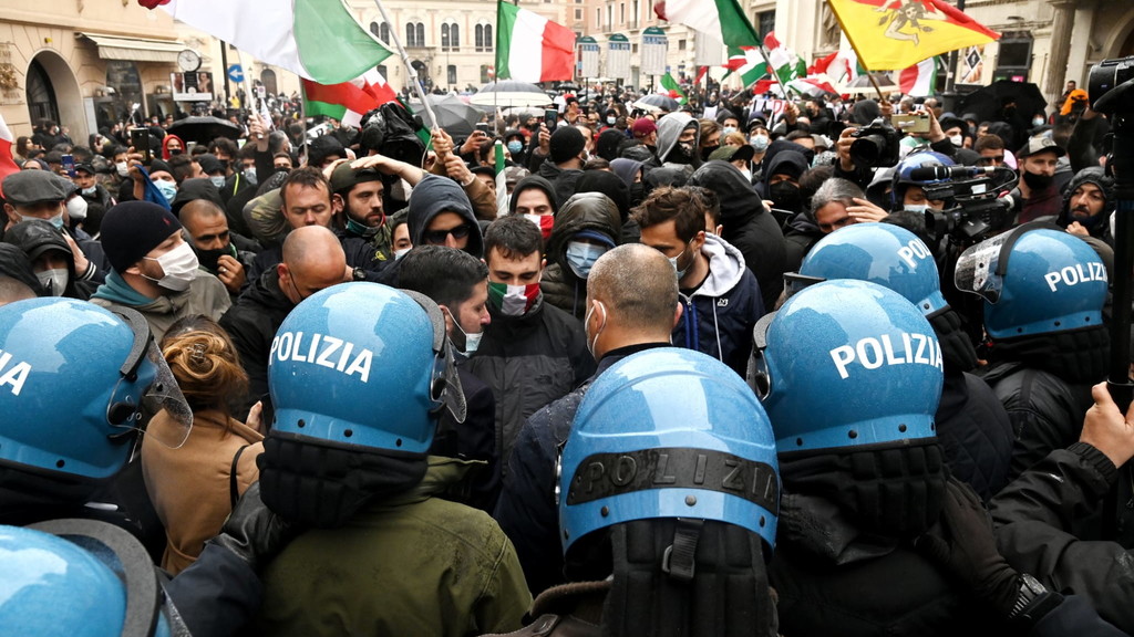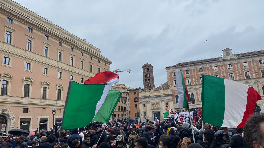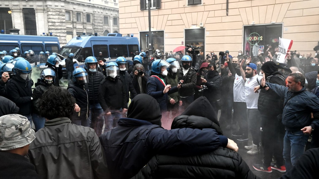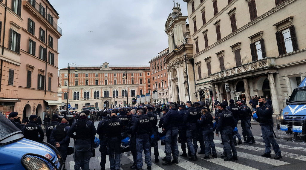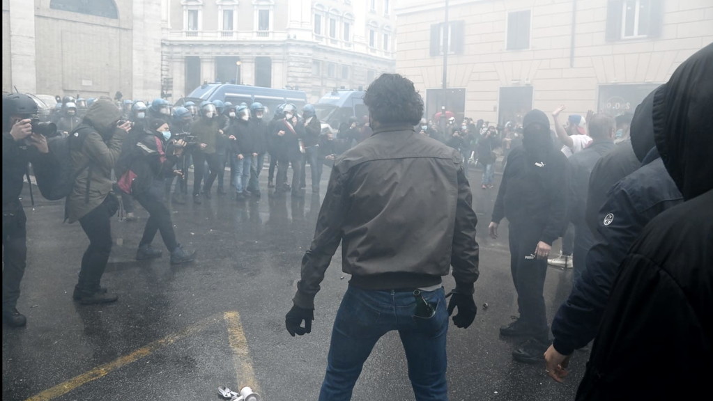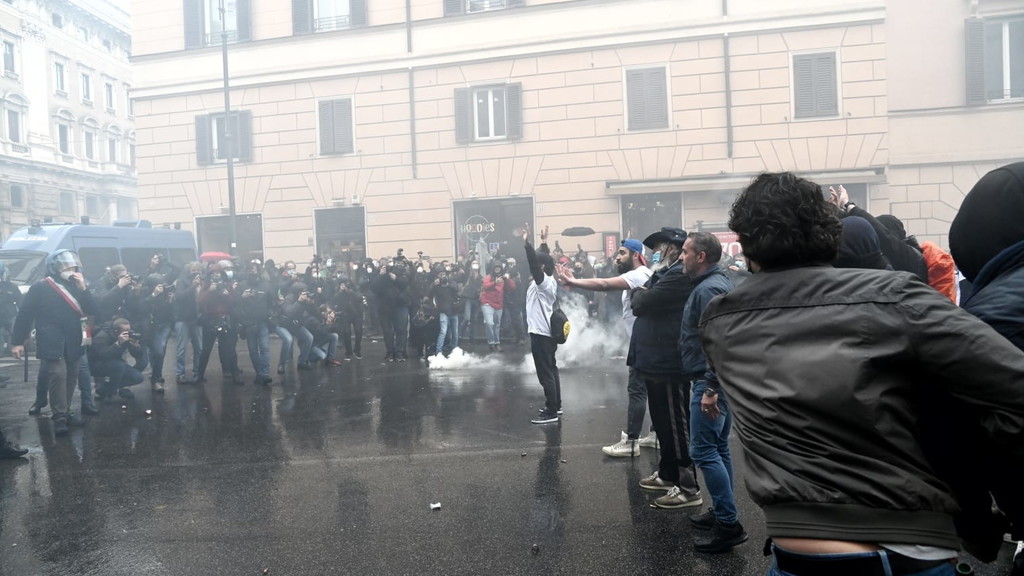 Fumogeni, bombe carta e petardi lanciati dai manifestanti. La polizia ha cercato di disperdere la folla, con rapidi avanzamenti. Un manifestante è rimasto ferito da una bottiglia gettata contro le forze dell’ordine da un altro partecipante alla protesta. L’uomo è stato portato via dagli agenti e affidato alle cure degli operatori del 118. Anche CasaPound ha aderito alla manifestazione dei ristoratori "Io Apro", portando scompiglio. Momenti di tensione sono scoppiati quando i militanti, con le braccia alzate, si sono diretti verso il cordone delle forze dell’ordine. In testa c’è il gruppo di alcuni giovani di estrema destra che hanno lanciato fumogeni e bombe carta sul lato di via del Tritone. Contro di loro si sono levate le proteste di alcuni ristoratori: «Non siete lavoratori, cosa volete?». Intanto gli agenti in tenuta antisommossa hanno posizionato i blindati per evitare che i manifestanti possano arrivare a Montecitorio. Mohamed Momì El Hawi, 34 anni, ristoratore di Firenze, leader del movimento "Io Apro", si è ammanettato in piazza San Silvestro chiedendo alle forze dell’ordine di far passare i manifestanti: «Fateci passare, fateci passare». Circa 300 i ristoratori e i commercianti, che gridano «Libertà, libertà», arrivati con treni e pullman dal nord e dal sud Italia, nonostante la questura avesse ben specificato che nessuna autorizzazione era sta concessa per manifestare. Già lo scorso martedì, in una manifestazione autorizzata di "Io apro", si erano registrati degli scontri. I manifestanti oggi i sono radunati in piccoli gruppi già a partire dalle 13 in piazza San Silvestro, con l’intenzione di «marciare» verso piazza Montecitorio, occupata da un’altra manifestazione autorizzata per 100 persone. Via del Corso e le piazze limitrofe però sono state chiuse (con transenne e blindati) dalle forze dell’ordine in tenuta antisommossa. All’arrivo degli ultimi gruppi di manifestanti il corteo ha iniziato a sventolare la bandiera dell’Italia e gridare «Riaperture subito». Un elicottero sorvola la zona dall'alto, mentre decine di poliziotti e carabinieri presidiano il centro. C'è anche una camionetta con gli idranti pronta ad allontanare la folla.
