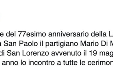 La sindaca grillina, criticata dagli utenti per l'errore, ha poi corretto il post sui social pubblicandolo con la data corretta: "Oggi, in occasione del 77esimo anniversario della Liberazione di Roma, ho incontrato a Porta San Paolo il partigiano Mario Di Maio, testimone del bombardamento di San Lorenzo avvenuto il 19 Luglio del 1943. Oggi Mario ha 92 anni e ogni anno lo incontro a tutte le cerimonie per ricordare gli anniversari importanti per la città come quello di oggi".