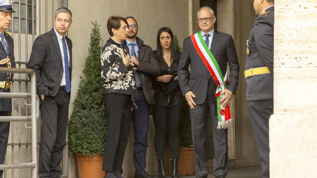 Presenti tra le istituzioni anche il Prefetto di Roma Bruno Frattasi, il presidente del consiglio comunale di Roma Svetlana Celli, l'assessore ai grandi eventi Alessandro Onorato, l'ex sindaco di Roma Virginia Raggi. Nel pomeriggio, anche il leader del Movimento 5 Stelle, Giuseppe Conte. "Ha fatto la storia della tv italiana - ha affermato -. Ha dato un grande contributo non solo allo spettacolo ma anche all'informazione". Tra i volti noti anche Rosario Fiorello con la moglie Susanna Biondo. Lo showman ha posato le mani in segno di raccoglimento ai lati del feretro.