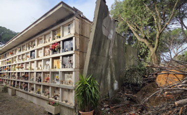 Cimitero Flaminio, ingresso Nord. Una parte dell’area dei blocchi da qualche giorno è delimitata da reti rosse e nastri che dovrebbero impedire ai visitatori di avvicinarsi ad almeno tre strutture adiacenti a grandi pini. Dovrebbero, appunto, il condizionale è d’obbligo perché da lontano si potrebbe non notare subito il motivo di questa precauzione, ovvero che la lastra di cemento che riveste una parete di uno dei blocchi dove ci sono decine di loculi si è staccata - letteralmente - e rischia di crollare sopra la testa di eventuali malcapitati. A causare il distacco è stato il crollo di uno degli alberi accanto ai blocchi, un grande pino venuto giù la scorsa settimana e piombato proprio addosso al parallelepipedo di cemento. La lastra si è staccata e oggi resta «legata» alla struttura principale per pochi centimetri.