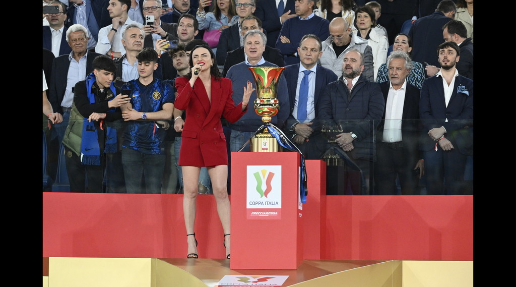 La giacca rossissima che fa da vestito e la scollatura profonda che tifosi e fan apprezzano. Arisa dà voce alla finale di Coppa Italia all'Olimpico tra Juve e Inter e lo spettacolo sulle note del Canto degli Italiani è garantito. L'Inno risuona allo Stadio Olimpico prima dell'inizio del match di serie A ma gli occhi puntati sono tutti su di lei, elegantissima in rosso. Ormai la cantante, pluripremiata, autrice e conduttrice televisiva, è un'icona della musica italiana. E non manca l'incidente hot mentre allarga le braccia e mostra il decollete generoso.