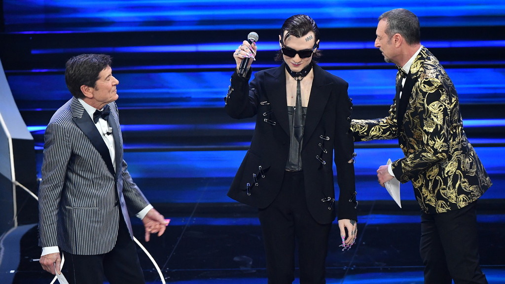 Rosa Chemical: il rapper era certamente tra coloro destinati a stupire e, difatti, si presenta all’Ariston con un paio di occhiali da sole e unghie lunghissime e laccate bene in vista. Sceglie un total look firmato Moschino, stile punk, con pantalone nero aderente che finisce dentro gli anfibi, blazer nero con tagli sparsi e spille da balia e, dulcis in fundo, un corpetto in ecopelle nera aderente con bretelle, in pendant con il chocker. Sorprendente? Sicuramente si, ma può sorprenderci ancora di più nelle prossime serate!