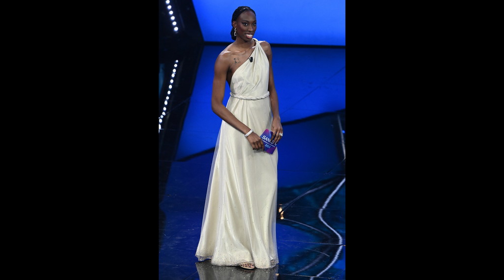 Paola Egonu: la co-conduttrice si rifà alle vestali dell’antichità con un abito in chiffon color cipria, lungo e morbido. Il modello monospalla si arricchisce da una treccia raffinata che scende dietro la schiena ed avvolge la vita. La firma è di EA7, linea sportiva di Emporio Armani, la stessa delle scarpe: in questo caso la Egonu sceglie un tacco basso e squadrato(cui tanto si era discusso nelle anticipazioni). I Gioielli, semplici ma luminosi, portano invece la firma di Pomellato. Brava Paola, senza troppi fronzoli hai reso perfettamente il concetto di eleganza.